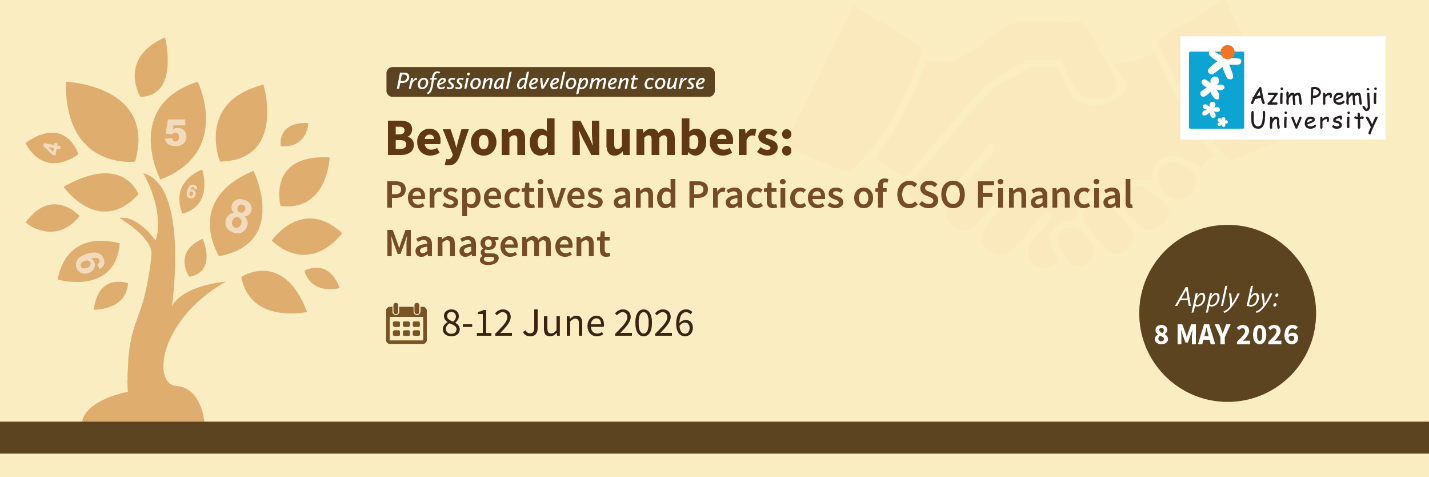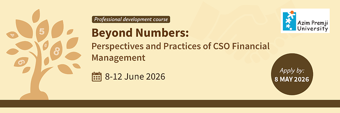 This 5‑day course is designed to strengthen the capacity of finance professionals in small CSOs (annual budget under INR 5 Cr). It will focus on both perspectives (the role of finance in strengthening CSOs) and practices (hands-on skills, tools, and strategies) to build strong financial systems and ensure compliance, accountability, and sustainability for small CSOs.